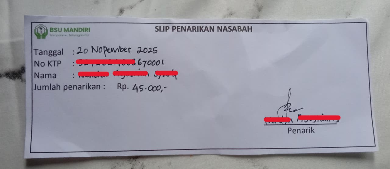 Tidak lama berselang, Ibu Iis mengirimkan slip penarikan resmi sebesar Rp 45.000, dan saya memprosesnya melalui aplikasi. Prosesnya cepat, tertib, dan tercatat dengan baik.